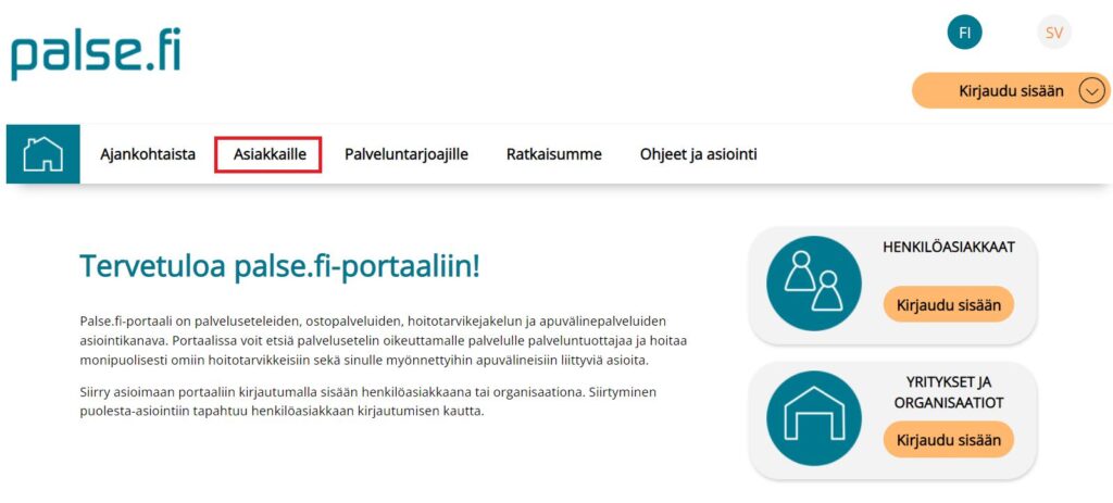 Aloita portaalissa asiointi kirjautumalla sisään henkilöasiakkaana. Kirjautuminen tapahtuu päätöksen tiedoilla tai suomi.fi-tunnistautumisen avulla. Tarkemmat ohjeet kirjautumiseen löydät täältä.